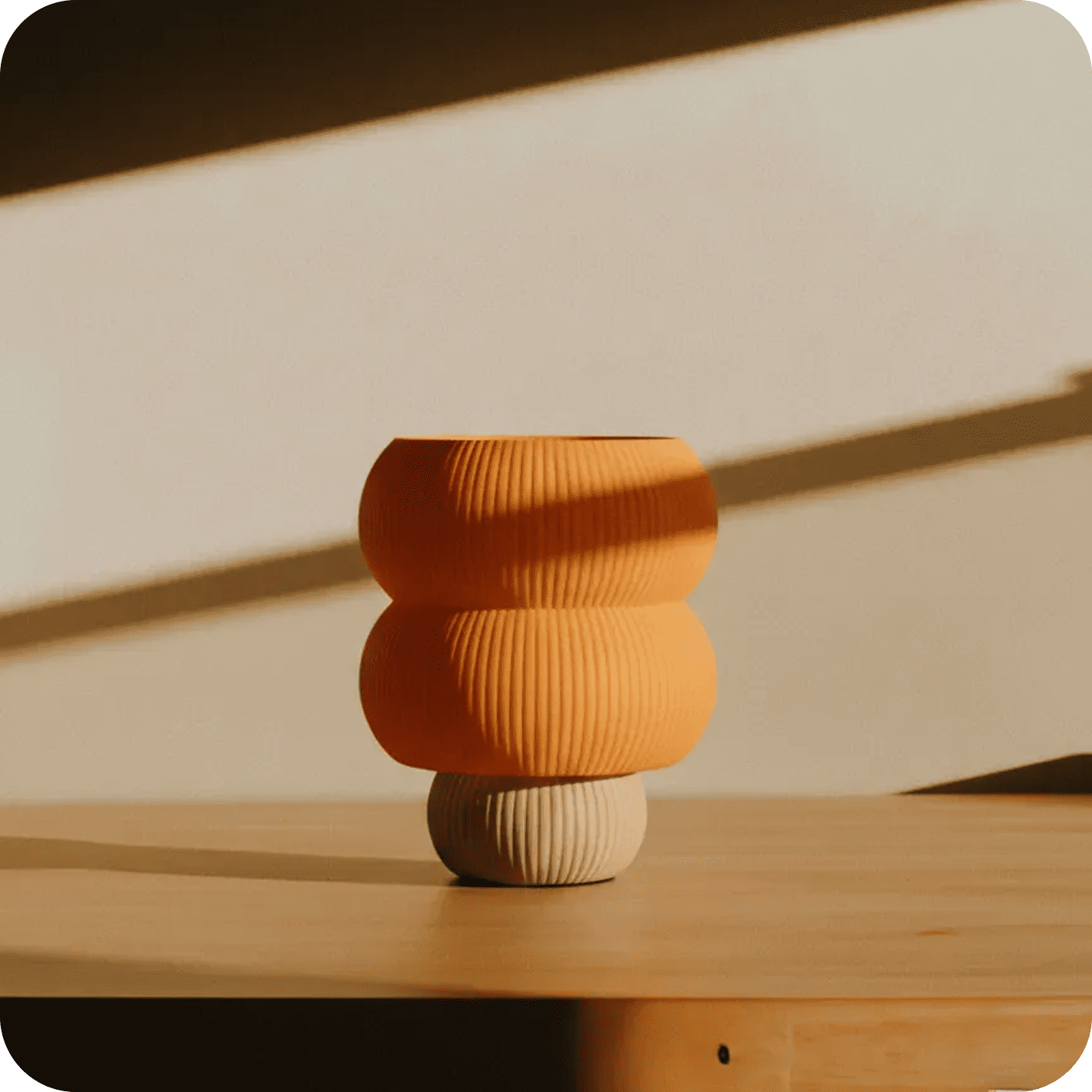 Totem No. 3 is a sculptural table lamp defined by stacked, rounded forms that feel both playful and grounded. Its vertical silhouette creates a strong presence while the softly ribbed surface diffuses light evenly, adding warmth and depth to the space.